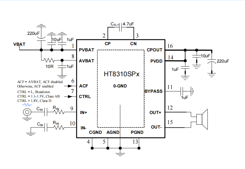 產(chǎn)品名稱:HT8310 電容式升壓功放 單聲道 5.2V AB/D類 完全替代CS4230E