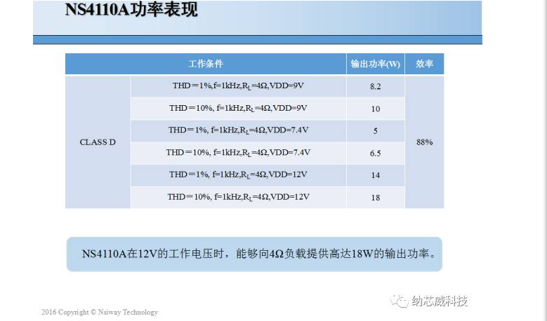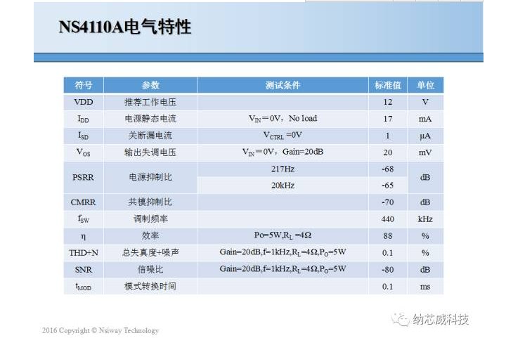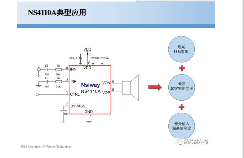 納芯威科技全新推出20W單聲道D類音頻功放NS4110A。NS4110A是一款差分輸入,超低EMI,無需濾波器,20W單聲道D類音頻功率放大器。通過高低電平控制芯片開啟與關(guān)斷,當(dāng)高電平時(shí)芯片進(jìn)入D類工作模式,低電平時(shí)芯片關(guān)斷,應(yīng)用靈活方便。NS4110A 采用先進(jìn)的技術(shù),在全帶寬范圍內(nèi)極大地降低了 EMI 干擾,最大限度地減少了對(duì)其他外部元件的影響。其輸出無需濾波器的 PWM 調(diào)制結(jié)構(gòu)減少了外部元件、PCB面積和系統(tǒng)成本。NS4110A在12V的工作電壓時(shí),能夠向4?負(fù)載提供高達(dá)18W的輸出功率,88%以上的效率更加適合便攜式音頻系統(tǒng)。