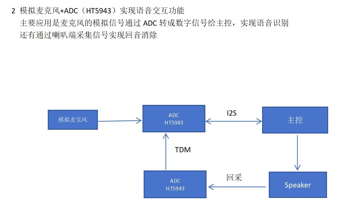 模擬麥克風(fēng)采到信號(hào),通過(guò)ADC(HT5943)轉(zhuǎn)化為數(shù)字信號(hào),在傳給主控。主控處理后,直接推喇叭 或者 讓功放放大后在推喇叭。 在用ADC(HT5943)進(jìn)行信號(hào)回采與原信號(hào)比較,來(lái)消除回音。隨著主控功能越來(lái)越強(qiáng)大,用ADC(HT5943)回采消除噪音的越來(lái)越少。