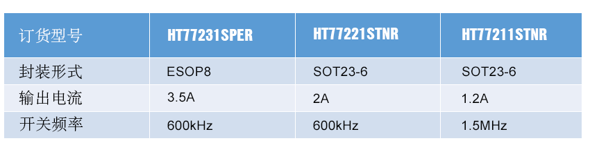 ?3.5A (HT77231) /2A (HT77221) /1.2A (HT77211) 降壓,內(nèi)置100mΩ和60mΩ功率管