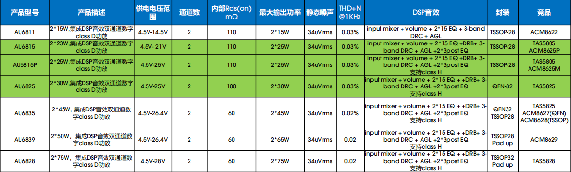 二、 AU6815、AU6815P、AU6825與TAS5805、TAS5825、ACM8625P、ACM8625M腳位兼容,可以根據(jù)電壓與功率進(jìn)行選擇。