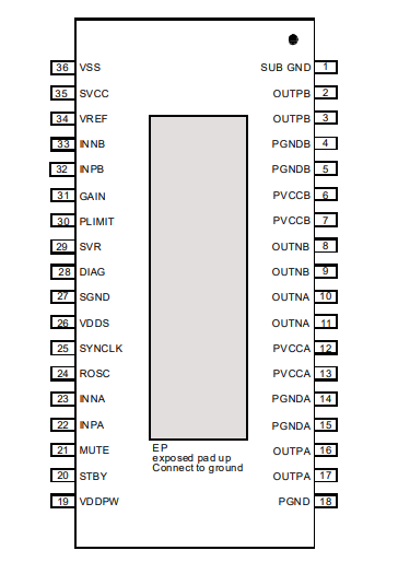 Description The TDA7492E is a dual BTL class-D audio amplifier with single power supply designed for home audio applications. The device is housed in a 36-pin PowerSSO package with exposed pad up (EPU), and as a result of its high efficiency, a simple heatsink is required.