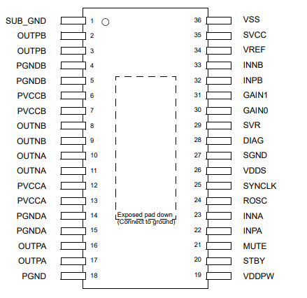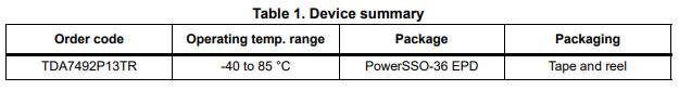 Features ? 25 W + 25 W continuous output power at THD = 10% with VCC = 20 V and RL = 8 ? ? Wide-range single-supply operation (8 - 26 V) ? High efficiency (? = 90%) ? Four selectable, fixed gain settings of nominally 21.6 dB, 27.6 dB, 31.1 dB and 33.6 dB ? Differential inputs minimize common-mode noise ? Standby and mute features ? Short-circuit protection ? Thermal overload protection ? Externally synchronizable ? ECOPACK®, environmentally-friendly package