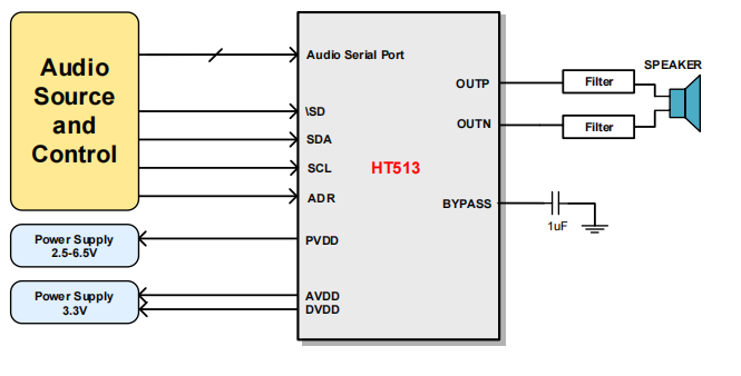 產(chǎn)品名稱:HT513 2.8W I2S輸入單聲道D類音頻功率放大器