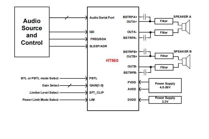 HT560是一別S輸入的立體聲D類音頻功放支持多種采樣頻率,包含兩種速率模式。