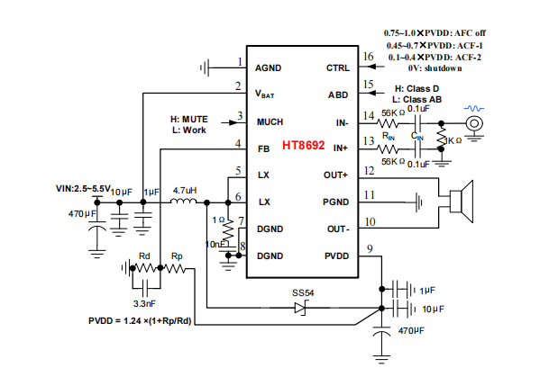 HT8692具有AB類(lèi)和D類(lèi)的自由切換功能,在受到D類(lèi)功放EMI千擾困擾時(shí),可隨時(shí)切換至AB類(lèi)音頻功放模式。