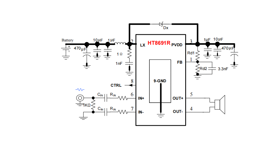 HT8691R內(nèi)部集成免濾波器數(shù)字調(diào)制技術(shù),能夠直接驅(qū)動揚(yáng)聲器,并最大程度減小脈沖輸出信號的失真和噪音。輸出無需濾波網(wǎng)絡(luò),極少的外部元器件節(jié)省了系統(tǒng)空間和成本,是便攜式應(yīng)用的理想選擇。