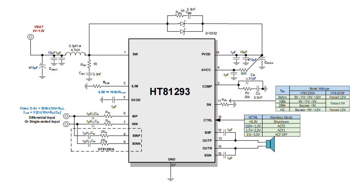 HT81293A內(nèi)置可動態(tài)調(diào)節(jié)的升壓,可以提供一個適應(yīng)不同輸出功率的電壓給D類功放,其可大幅提高系統(tǒng)效率,延長電池續(xù)航時間。HT81293F則內(nèi)置固定升壓,提供一個固定9V或12V的升壓給D類功放。HT81293可配置升壓限流值,以防止過大的電流尖峰。