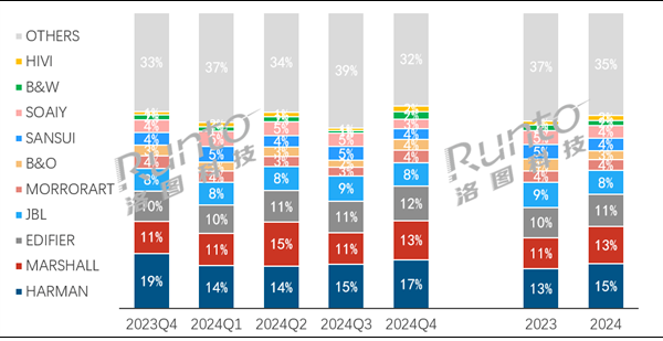 在這一領(lǐng)域,哈曼卡頓憑借15.2%的銷額份額榮登榜首,較上年增長1.8個百分點,其家居式桌面音箱與電腦音箱系列,尤其是琉璃水晶音箱,憑借卓越顏值成為網(wǎng)紅爆款,持續(xù)引領(lǐng)市場潮流。