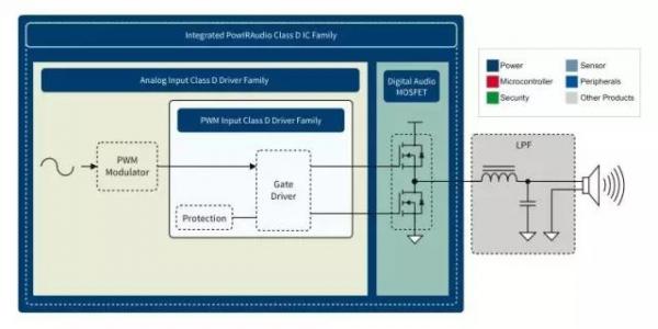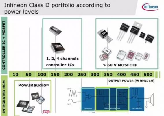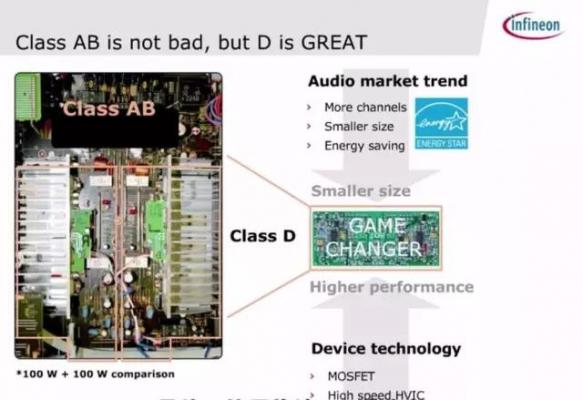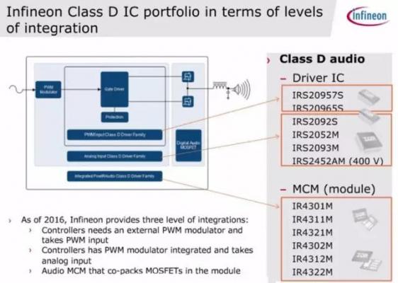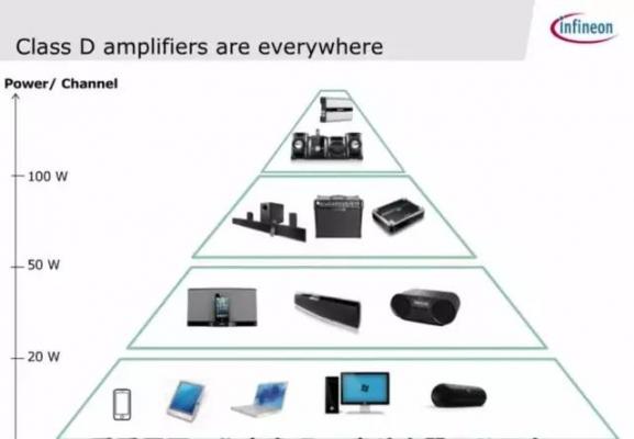 作為物聯(lián)網(wǎng)率先落地的細分領域,智能家居勢頭依舊如火如荼。行業(yè)巨頭的競相入場,也讓智能音箱成下一個風口,但是,再智能的音箱也需要好音質~今天小編就跟你聊聊好音質的核心——音頻放大器,特別是其中的翹楚D類音頻放大器。 D類音頻放大器 眾所周知,D類音頻放大器正在迅速成為專業(yè)和家庭音頻和視頻系統(tǒng)的首選解決方案,而英飛凌致力于提供一整套全面的分立和集成IC產(chǎn)品組合,以簡化高效率D類放大器設計,其中包含數(shù)字音頻驅動器,D類音頻MOSFET以及將數(shù)字音頻控制器IC和MOSFET集成在緊湊型PQFN封裝中的PowIRaudio?集成電源模塊。是時候讓小編帶你了解一下英飛凌D類音頻放大器的“前世今生”了~ 什么是D類音頻放大器? 音頻放大器一般分為線性放大器和開關放大器,A,B,AB以及C類等線性放大器都是工作在開關的線性放大區(qū)。而開關放大器則在開關全開或者全關時運行,D類音頻放大器正是開關放大器的一類。 工作原理 D類音頻放大器使用MOSFET作為全能的開關以消除功率損耗,為了使放大器只有導通或者關斷的狀態(tài),D類放大器使用PWM信號傳達放大信號和音頻信號。PWM體現(xiàn)的是導通和關斷時間與模擬值的比例,MOSFET通過調節(jié)占空比實現(xiàn)這一點。 脈沖產(chǎn)生模塊通過比較器和載波信號,將模擬信號轉化為PWM信號,PWM信號具有與輸入音頻信號成比例的瞬時平均值,輸出級構建了與比較器輸出相同形狀,但幅值為電源電壓的PWM,這是D類放大技術的核心。因為PWM的平均值代表音頻信號,只需使用低脈沖過濾器就能消除載波信號,提取向揚聲器反饋的放大音頻信號,整個設置將僅在導通或關斷狀態(tài)時使用功率器件。 D類音頻放大器工作原理 D類是目前適用范圍最廣的放大器類型,使用實例包括筆記本電腦,條形音箱,音樂放大器,汽車音響等。 D類的“優(yōu)秀”,不比較不知道 下圖左側是典型的100W+100W 立體聲AB類放大器,尺寸為7*8英寸。 眾所周知,一方面,音頻放大器的市場趨勢走向尺寸更小,通道更多,功耗更低,而使用傳統(tǒng)AB類音頻則無法達到新的能源星級規(guī)范要求的較高效率。另一方面,功率器件技術的巨大進步,使得在導通電阻僅幾毫安的情況下,就能精確地重現(xiàn)PWM信號,得益于兩者的結合造就了高效的D類音頻功率放大器。 從上述例子可以看出,100W+100W 立體聲AB類放大器,可以對標為無需使用散熱器,信用卡大小的D類音頻放大器。因此,D類音頻放大器可以造就新型的音頻產(chǎn)品。作為一種創(chuàng)新產(chǎn)品,D類音頻放大器使音頻系統(tǒng)更加時尚、方便。 應用?無處不在! 環(huán)顧周圍,你會發(fā)現(xiàn)D類音頻放大器無處不在,只是大小不同而已: 叫你起床的鬧鐘,手機擴展塢,或者智能手機,所有的聲音都是通過D類放大器驅動發(fā)出的; 開車上班時,車上廣播或者老CD播放出的聲音,也是通過D類放大器發(fā)出的; 打開工作間或者打開筆記本電腦的那一刻,你就打開了D類放大器產(chǎn)品,它以各種形式存在于我們的生活中。 小編按照通道功率從低到高的順序列出一些最終應用示例,如上圖所示: 在20W以下,D類放大器廣泛出現(xiàn)在智能手機、筆記本電腦、臺式電腦、便攜式藍牙音箱上; 從20W到50W,比較常見的示例包括擴展塢,入門級條形音箱和便攜式揚聲器音箱; 50W及以上則包括高端條形音箱,低音炮和樂器放大器,原裝音頻,Mini Compo和功率揚聲器。 英飛凌D類放大器? 英飛凌的D類放大器解決方案結合高級高壓控制器和同類最優(yōu)的MOSFET開關,針對以高功率、高效率、高級音頻性能和可擴展設計為主的應用。因此,英飛凌的D類放大器解決方案專注于中高功率應用,在100W以上的應用中廣受歡迎,現(xiàn)在也也常見于50W~100W的應用中。 若要論細分市場,英飛凌目前則專注于3個市場:家用音響,專業(yè)消費者和汽車音響。 據(jù)此,英飛凌主要提供兩種D類產(chǎn)品:即分立和集成解決方案: 01 分立解決方案 我們首先看分立解決方案的產(chǎn)品,在系統(tǒng)框圖中,控制器集成電路側分1,2,4通道,可以形成不同的通道數(shù)量,MOSFET級有60V及以上的MOSFET,RDS(on)為30~90mΩ,每個通道100W以上。在英飛凌并購IR的基礎上,OptiMOS?增加了較低的RDS(on),采用了更高的功率范圍,提高了效率。 02 集成解決方案 集成解決方案在一個PQFN封裝中,同時包含了控制器集成電路和MOSFET,由于一個封裝中包含多個硅片,因此稱之為多芯片模塊MCM。集成解決方案具備分立式解決方案的所有優(yōu)點,例如同類最佳效率,消除了對散熱器的需求,穩(wěn)健的電壓承載能力和輸出功率的可擴展性等。此外,目前集成解決方案每個通道都高達150W,隨著硅技術的發(fā)展,集成解決方案的功率范圍也會隨之提高。 英飛凌不同集成程度的D類放大器產(chǎn)品組合 系統(tǒng)了解了英飛凌的D類音頻放大器后,小編幫你順便從技術角度概括出英飛凌D類放大器解決方案的2大優(yōu)勢: 1. 高壓集成電路處理; 2. 同類最優(yōu)的中高壓MOSFET,具備最佳品質因數(shù)有助于減少熱量耗散,因此客戶可以減少散熱器成本,或者根本不需要散熱器。 總之,高功率、高效率、卓越的音頻性能和可擴展的設計始終是英飛凌D類音頻放大器帶給客戶的核心價值. |