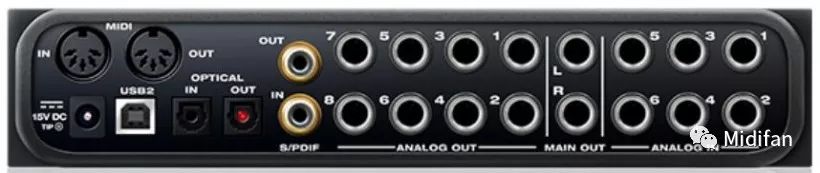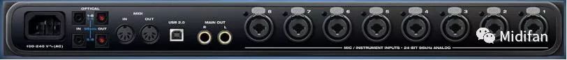 很多接口的參數(shù)上會寫著比如:18個輸入通道。但是你在上面只看到8個前級放大輸入。那是因為除了這8個輸入以外,還有一組ADAT的輸入,它的一個插孔提供了8個通道,另外S/PDIF一個插孔會提供兩個通道。