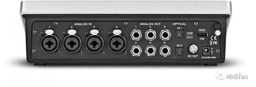 Apogee Quartet背面有4個話放和6個輸出,本身就可以組建5.1環(huán)繞聲,如果輸入輸出不夠的話可以通過光纖接口擴展,添加至12模擬入&14模擬出。