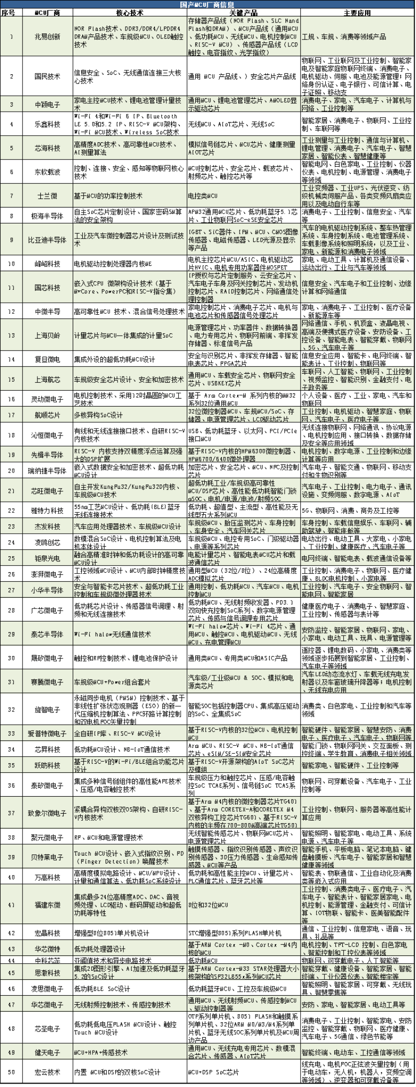 以下為筆者整理匯總的50家國產(chǎn)MCU企業(yè)及其核心技術(shù)和關(guān)鍵產(chǎn)品信息: