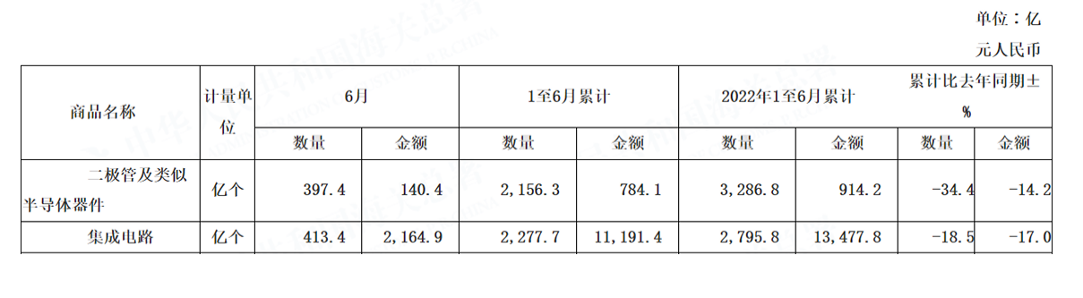 根據(jù)中國(guó)海關(guān)總署的最新消息,2023年上半年我國(guó)的集成電路進(jìn)口數(shù)量為2,277.7億個(gè),金額為11191.4億元。與去年同期相比,進(jìn)口數(shù)量下降了18.5%,金額下降了17%。而二極管及類似半導(dǎo)體器件的進(jìn)口數(shù)量為2156.3億個(gè),金額為784.1億元,同比下降了34.4%和14.2%。