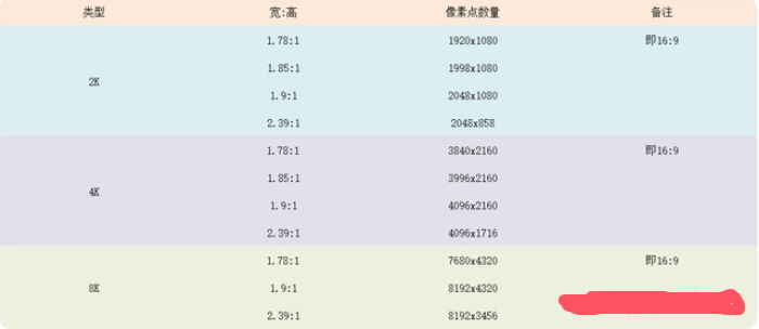 在顯示系統(tǒng)中,2K、4K和8K代表的是不同尺寸的圖像類別,每一種尺寸類別都有嚴(yán)格規(guī)定的像素點(diǎn)數(shù)量,從而實(shí)現(xiàn)不同的寬高比例。為規(guī)范和統(tǒng)一數(shù)字顯示標(biāo)準(zhǔn),為每個(gè)K值類別中的不同的寬高比定義了像素?cái)?shù),分別如下: