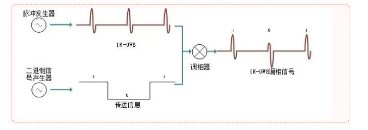 下圖是使用相位調(diào)制方式傳輸二進制歸零碼的IR-UWB信號產(chǎn)生示意圖: