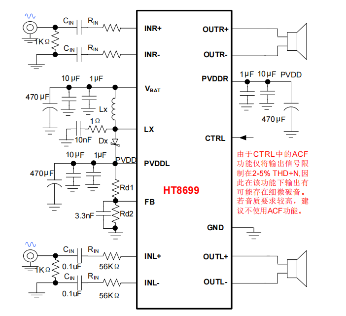 產(chǎn)片介紹:HT8699是一款內(nèi)置BOOST升壓模塊的立體聲音頻功率放大器。在D類模式下,內(nèi)置的BOOST升壓模塊可通過外置電阻調(diào)節(jié)升壓值,即使是鉀電池供電,在升壓至7V時(shí),10% THD+N,4Q負(fù)載條件下,能連續(xù)輸出2X5 5W 的功率。