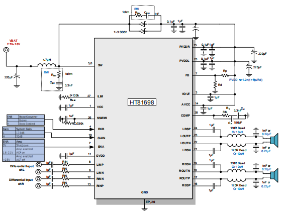 此外,HT81698內(nèi)部集成免濾波器調(diào)制技術(shù),能夠直接驅(qū)動(dòng)揚(yáng)聲器,內(nèi)置的關(guān)斷功能使待機(jī)電流最小化,還集成了輸出端過流保護(hù)、片內(nèi) 過溫保護(hù)、輸入電源欠壓異常保護(hù)、升壓電壓過壓保護(hù)等功能。