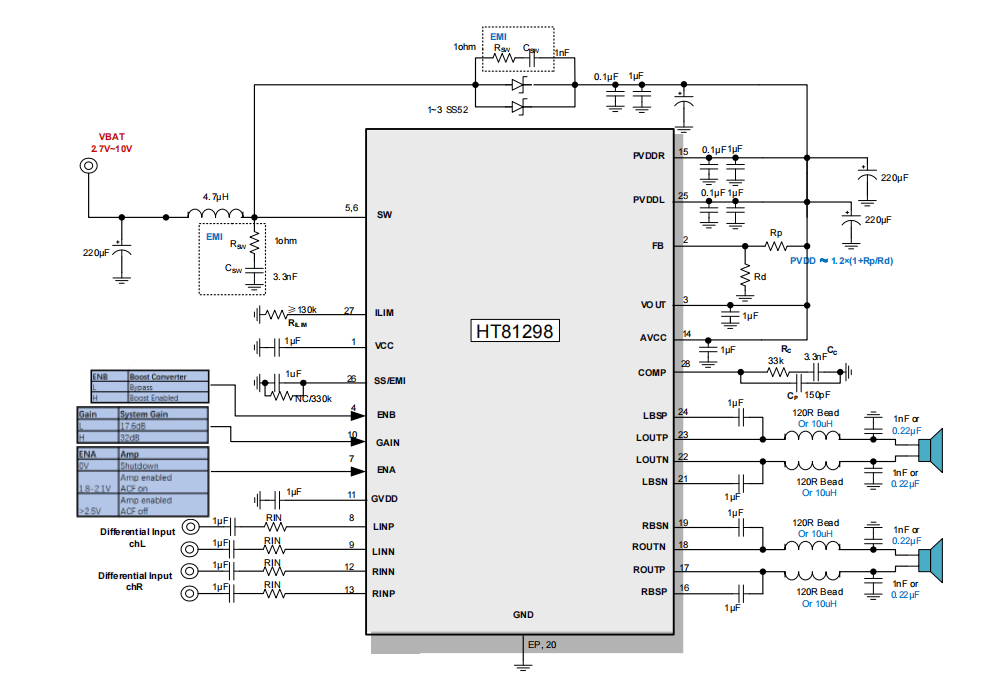 此外,HT81298內(nèi)部集成免濾波器調(diào)制技術(shù),能夠直接驅(qū)動(dòng)揚(yáng)聲器,內(nèi)置的關(guān)斷功能使待機(jī)電流最小化,還集成了輸出端過流保護(hù)、片內(nèi)過溫保護(hù)、輸入電源欠壓異常保護(hù)、升壓電壓過壓保護(hù)等功能。