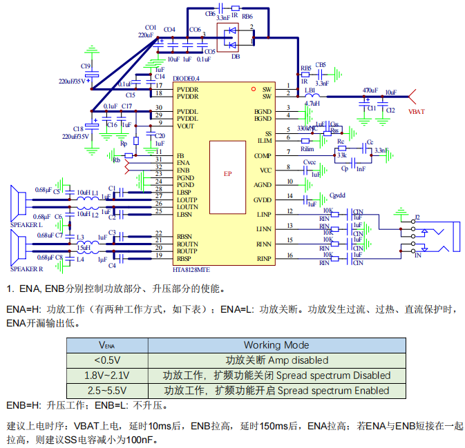 此外,HTA8128內(nèi)部集成免濾波器調(diào)制技術(shù),能夠直接驅(qū)動(dòng)揚(yáng)聲器,內(nèi)置的關(guān)斷功能使待機(jī)電流最小化,還集成了輸出端過(guò)流保護(hù)、片內(nèi)過(guò)溫保護(hù)、輸入電源欠壓異常保護(hù)、升壓電壓過(guò)壓保護(hù)等功能。