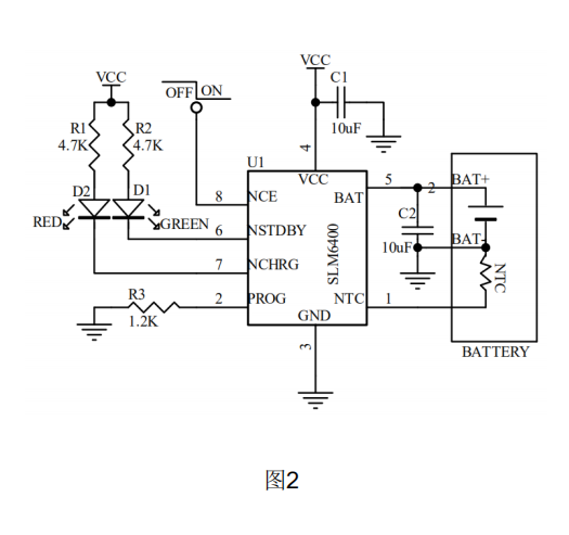 當(dāng)輸入電壓(交流適配器或USB電源)被 拿掉時,SLM6400 自動進入一個低電流狀態(tài), 將電池漏電流降至5uA以下。SLM6400 在有電源時也可置于停機模式,可將輸入電源電流降至60uA。SLM6400的其他特點包括電池溫度檢 測、欠壓閉鎖、自動再充電和兩個用于指示充電、結(jié)束的LED 狀態(tài)引腳。