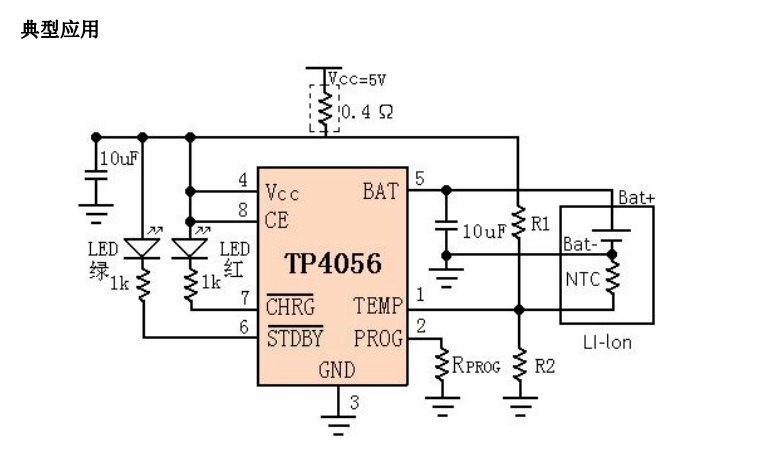當(dāng)輸入電壓(交流適配器或 USB 電源)被拿掉時(shí),TP4056 自動(dòng)進(jìn)入一個(gè)低電流狀態(tài),將電池漏電流降至 2uA 以下。TP4056 在有電源時(shí)也可置于停機(jī)模式,以而將供電電流降至 55uA。TP4056 的其他特點(diǎn)包括電池溫度檢測(cè)、欠壓閉鎖、自動(dòng)再充電和兩個(gè)用于指示充電、結(jié)束的LED 狀態(tài)引腳。