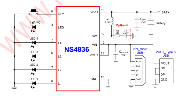 產(chǎn)片介紹:NS4836 是一款集成度非常高的移動(dòng)電源管理 芯片,內(nèi)部集成了線性充電管理模塊、同步放電管 理模塊、電量 LED 指示和手電筒模塊、保護(hù)模塊等。