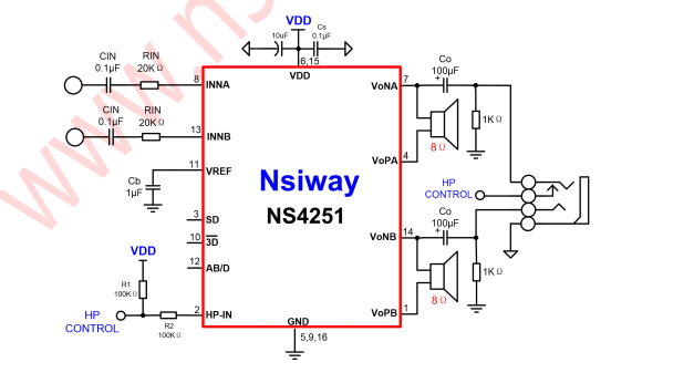 產(chǎn)品名稱:NS4251 3.0Wx2 雙聲道 AB/D 類雙模音頻功率放大器附加耳機(jī)模式