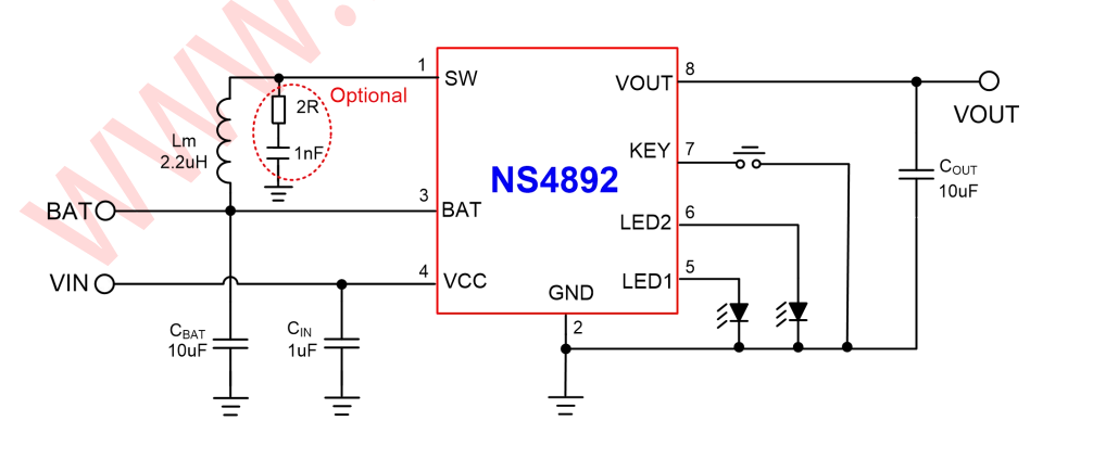 NS4892 充電模式支持(0V)涓流/恒流/恒壓三段式充電模式。放電模式采用1MHz的PWM 工作方式,更高效為輸出提供升壓。