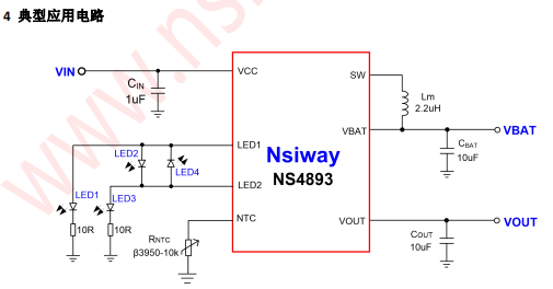 NS4893 內(nèi)置涓流/恒流/恒壓三段式充電模式, 且支持 0V 電池電壓充電。放電模式采用 1MHz 的同 步升壓結(jié)構(gòu),可以更高效為輸出提供升壓能力。