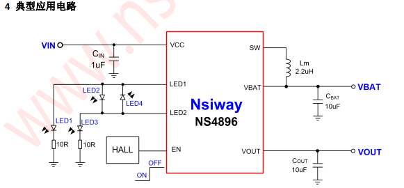 NS4896是一款單節(jié)鋰電池充電管理和電池狀態(tài)顯示的多功能電源管理芯片。芯片內(nèi)部集成了充電模塊和放電模塊,在應(yīng)用中僅需要極少的外圍就可以給客戶提供完整的解決方案。芯片帶EN引腳,支持霍爾芯片輸出控制。芯片還內(nèi)置多重保護(hù)功能,可以有效的保護(hù)電池不因異常狀態(tài)損傷。