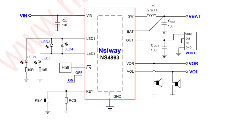NS4863是一款單節(jié)鋰電池充電管理和狀態(tài)顯示的多功能電源管理芯片。芯片內(nèi)部集成了充電模塊和放電模塊同時(shí)還集成有KEY和HALL等功能引腳,可以給客戶提供更靈活的選擇。芯片內(nèi)置涓流/恒流/恒壓三段式充電模式,且支持0V 電池電壓充電。恒流充電電流可以外部調(diào)節(jié)。放電模式采用同步升壓結(jié)構(gòu),內(nèi)部集成兩路輸出限流開關(guān),可以提供獨(dú)立的負(fù)載檢測(cè)。