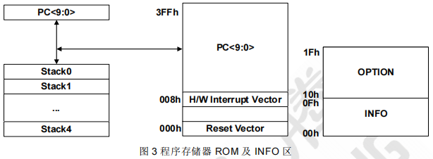 1K×14bit 的存儲(chǔ)空間,由 10 位 PC 指針訪問,復(fù)位地址為 000h。H/W 中斷向量地址 008h,支持 5 級(jí)堆棧,程序存儲(chǔ)器分布圖、INFO 區(qū)和堆棧結(jié)構(gòu)如下: