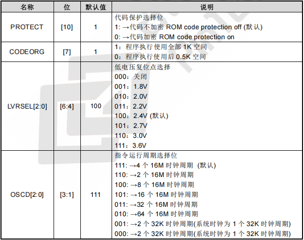 眠模式下。在一般操作或睡眠模式情況下,看門狗定時(shí)器的溢出都會(huì)導(dǎo)致 MCU 復(fù)位或喚醒同時(shí) TO 位被清零。如 WDTEN 位置零,看門狗定時(shí)器不能工作,看門狗溢出時(shí)間可以通過配置選項(xiàng) 0 的 SUT[1:0]設(shè)置為 16ms、8ms、256ms、128ms。需要看門狗溢出周期變長(zhǎng)可以通過設(shè)置 OPTION 寄存器 PS[2:0]使看門狗定時(shí)器分頻最大達(dá)到 1:128,此時(shí)最大看門狗溢出周期為 32.8 秒。預(yù)置器 配置給 WDT 的情況下(PSA=1),CLRWDT 指令能使 WDT 和預(yù)置器清零,啟用看門狗可以防止超時(shí),如果超時(shí) MCU 能復(fù)位。預(yù)置器配置給 WDT 的情況下(PSA=1),STOP 指令能使 WDT 和預(yù)置器清零,這樣就可以在看門狗溢出復(fù)位前,得到配置的睡眠時(shí)間。