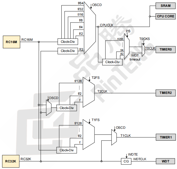 2/4/8/16/32/64 分頻,或 RC32K 時(shí)鐘的 2 分頻。WDT 采用 RC32K 時(shí)鐘,TIMER0 以指令時(shí)鐘或 WDT 溢出作為時(shí)鐘。TIMER1 采用 RC16M 分頻時(shí)鐘或 RC32K,TIMER2 時(shí)鐘則是 RC16M 或 RC32K 選出來后再分頻,CSR 啟動(dòng)時(shí)會(huì)自動(dòng)切換到使用 RC16M。