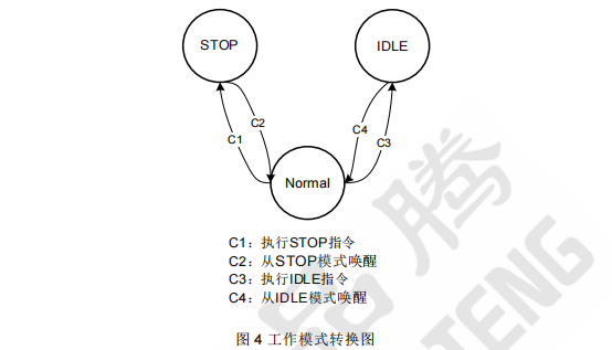 支持 Normal 模式、STOP 模式、IDLE 模式。模式描述如下: