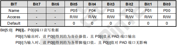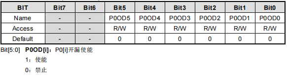 • P0 口有相應(yīng)的開漏控制位(P0OD 寄存器)來設(shè)置使能開漏輸出,當(dāng)開漏配置有效且數(shù)據(jù)寄存器