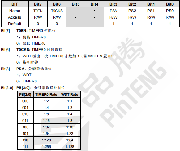 該寄存器主要用來配置與 TIMER0/WDT 分頻器、TIMER0 選項(xiàng)相關(guān)信息。