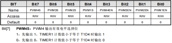TIMER1 為 8 位向上定時(shí)器,計(jì)數(shù)到 0xFF 后自動(dòng)裝載 T1OVR 值。其具有普通定時(shí)功能和 4 路 PWM輸出功能。