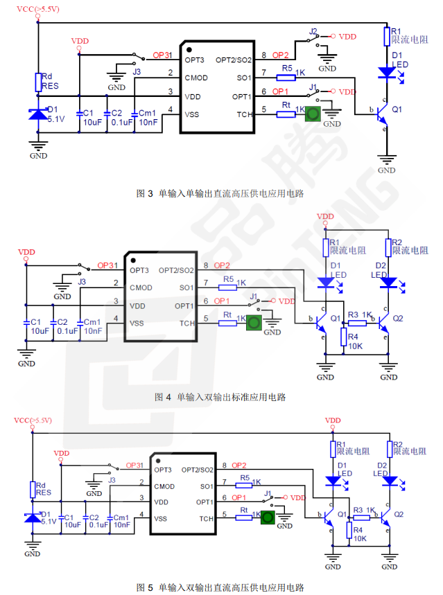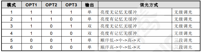 ● 共有六種功能可選,由 OPT1/OPT2/OPT3 管腳上電前的輸入狀態(tài)來(lái)決定。芯片管腳有