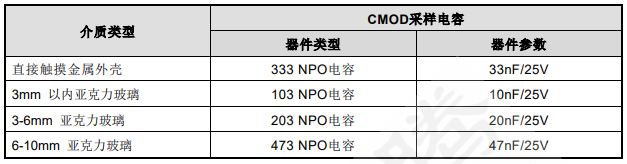 當(dāng)介質(zhì)材料及厚度等差異較大時(shí),可通過(guò)調(diào)整 CMOD 與 GND 之間的 Cm 電容來(lái)調(diào)節(jié)觸摸靈敏度。電容容值越大,靈敏度越高;電容容值越小,靈敏度越低。以下數(shù)據(jù)僅供參考,具體以實(shí)際為準(zhǔn)。