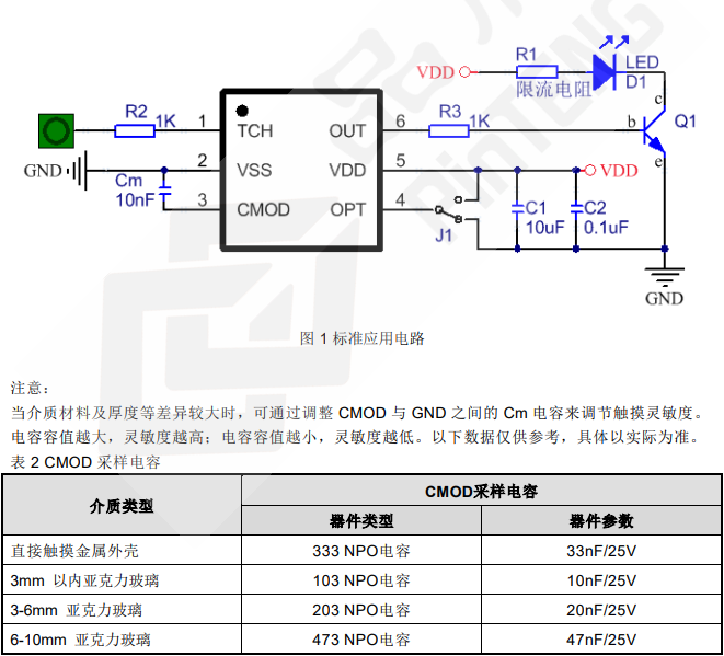 ● TCH 觸摸輸入對(duì)應(yīng) OUT LED 輸出有兩種模式可選,由 OPT 管腳上電前的輸入狀態(tài)來決定。