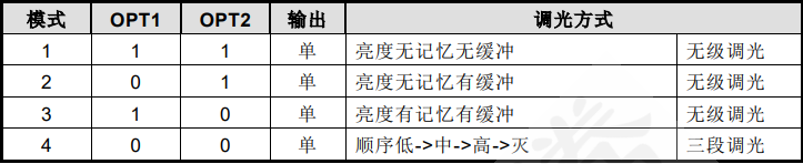 ● TCH 觸摸輸入對應 SO 燈光控制輸出(PWM)。共有四種功能可選,由 OPT1/OPT2 管腳上電前的輸入狀態(tài)來決定。芯片管腳有內(nèi)部上拉,懸空為 1,接 GND 為 0,具體如下表: