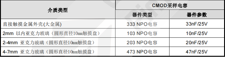當介質(zhì)材料及厚度等差異較大時,可通過調(diào)整 CMOD 與 GND 之間的 Cm 電容來調(diào)節(jié)觸摸靈敏度。