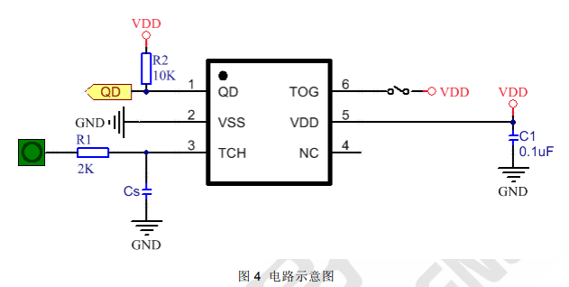5) 可利用 Cs 電容調(diào)整靈敏度,Cs 電容值越小靈敏度越高,靈敏度調(diào)整必須根據(jù)實(shí)際應(yīng)用的 PCB來(lái)做調(diào)整,Cs 電容值的范圍為 1~50pF。