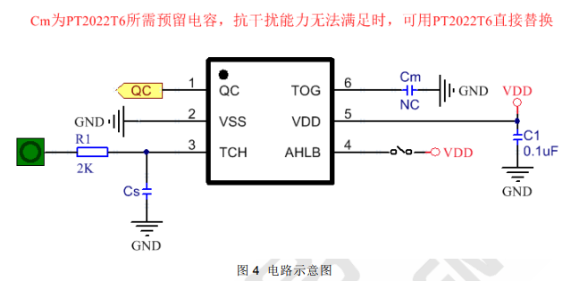 5) 可利用 Cs 電容調(diào)整靈敏度,Cs 電容值越小靈敏度越高,靈敏度調(diào)整必須根據(jù)實(shí)際應(yīng)用的 PCB來(lái)做調(diào)整,Cs 電容值的范圍為 1~50pF。