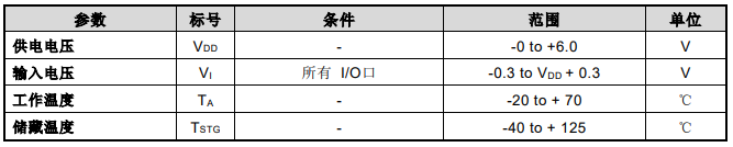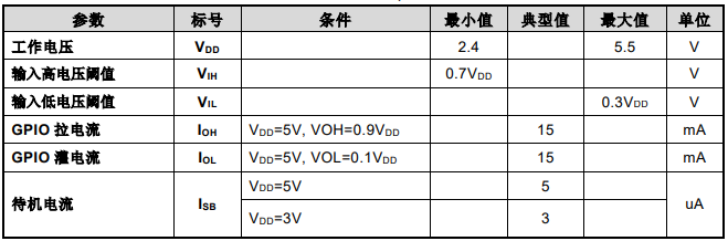 表 4 直流特性(如無特殊說明 VDD = 2.4V~5.5V,Temp = 25ºC)
