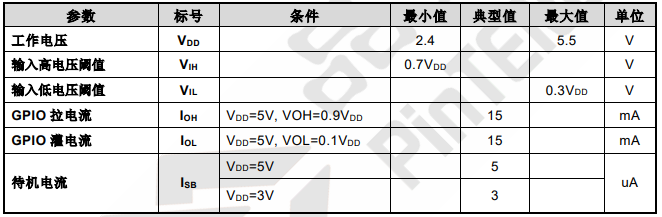 表 4 直流特性(如無特殊說明 VDD = 2.4V~5.5V,Temp = 25ºC)