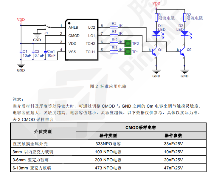 ● TCH1 觸摸輸入對(duì)應(yīng) LO1 邏輯輸出,TCH2 觸摸輸入對(duì)應(yīng) LO2 邏輯輸出。
