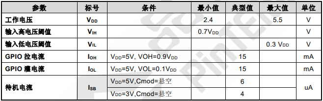 表 4 直流特性(如無(wú)特殊說(shuō)明 VDD = 2.4V~5.5V,Temp = 25ºC)